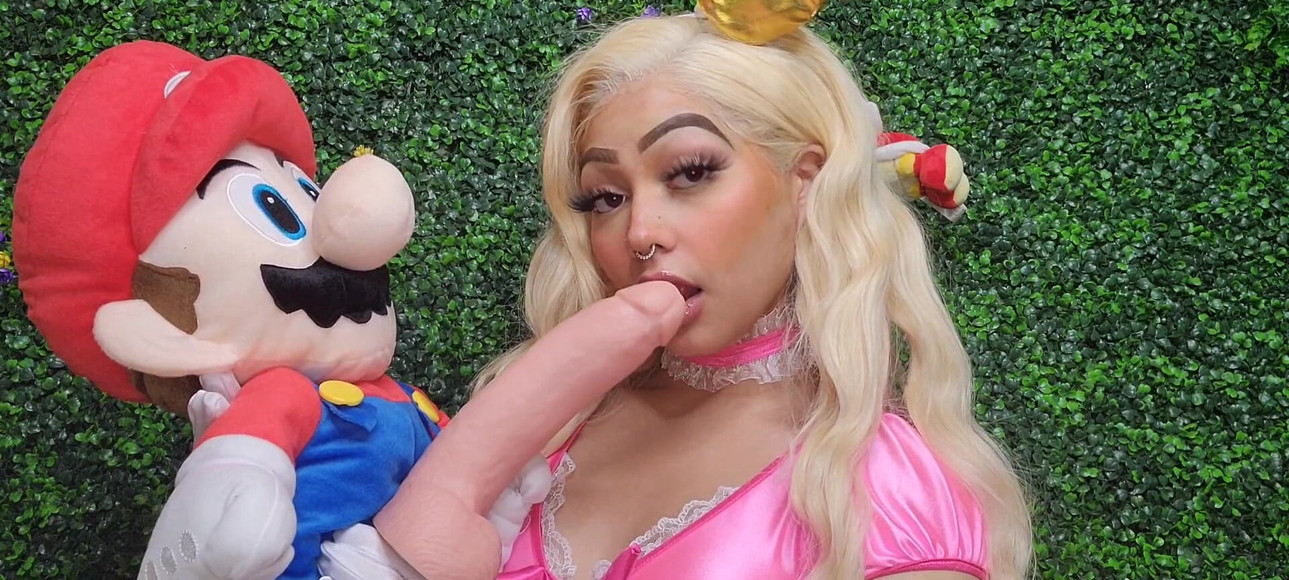 Watch as Mirage roleplays as Princess Peach. Join Peach as she practices oral tricks on her Mario pillow. This clip features dildo play/ mouth to dildo/ messy oral/ roleplay/ pillow play.