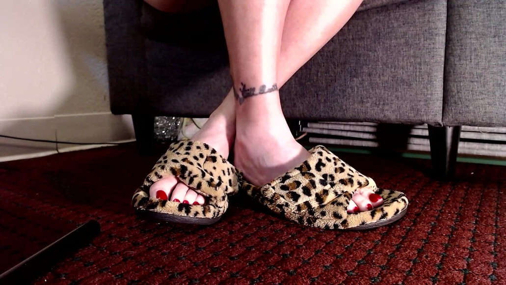 Annas feet nice closeup wiggling toes sliding and dipping in warm cozy slippers