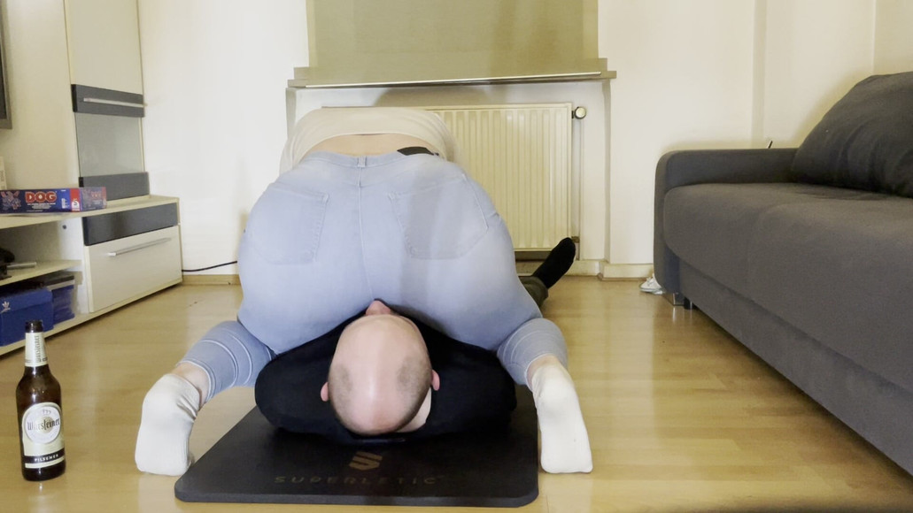 My slave is bound at the wrists and lies defenseless on the floor – perfectly positioned to serve as my personal seat. Wearing tight blue jeans, I plant myself firmly on his face in various positions. I control every breath, pressing my full weight down on him and savoring the way his face disappears beneath my big ass. Whether forward or reverse, I keep him pinned down for long moments until he squirms. 30 minutes of pure, merciless domination and face-sitting torment, leaving him no chance to escape.