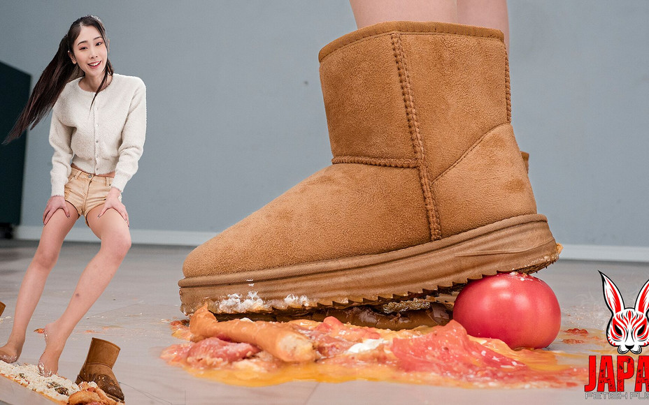 The feast is served on the floor. An Komatsu didn't come to eat. She came to ruin it wearing clean suede boots for now she stands in front of a loaded table. She grabs a piece of bread throws it down and steps on it. The sole twists the crumbs crackle. Then the eggs (250203_03)