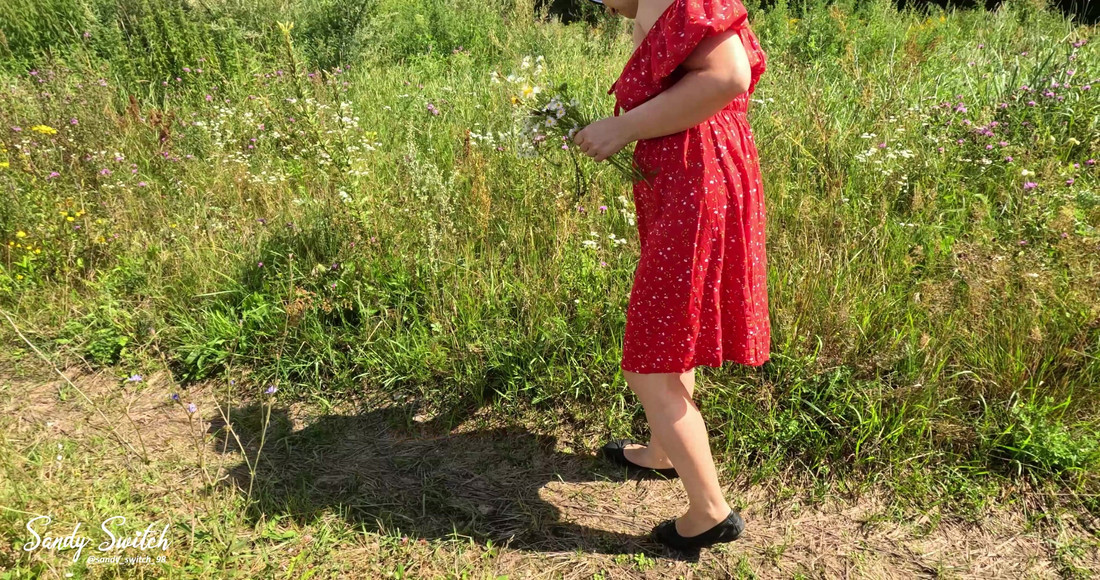 On a summer day, Sandy goes for a walk in nature. She puts on a beautiful dress and goes to the field. Sandy walks and picks flowers until she realizes she is not alone. Sandy meets a stranger. Her gorgeous body seduces the stranger, and Sandy gives him a nice blowjob.