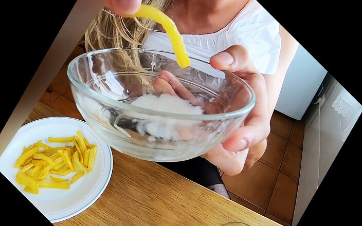 Sexy blonde crossdresser dipping french fries into her own cum shot. Fetish self cum eating with food