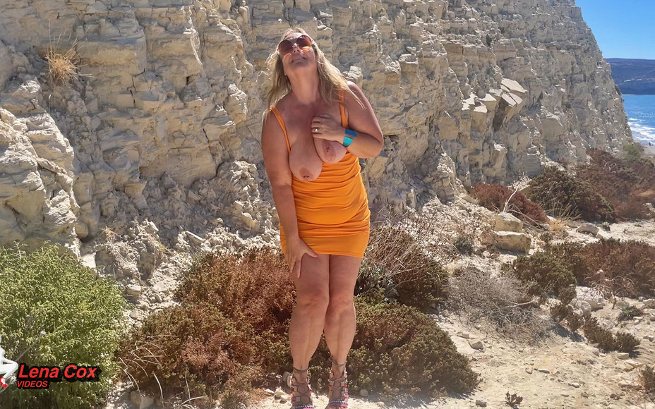 The sun, the sea, the thrill of being seen… Standing by the road on a hill above the water, I couldn’t oppose touching myself. My orange mini dress barely covers me as I pull my tits out and start teasing, feeling the breeze and the rush of danger. Then I kneel down, slide my fingers deep inside my wet pussy, and cum hard — moaning softly, hoping no one drives by. When it’s over, I fix my dress, smiling… still shaking from pleasure. I just love doing it where anyone could see me.