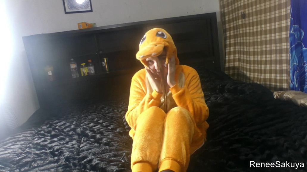 Renee Sakuya in a charizard suit dancing and stripping, silent film, sound was edited out due to music