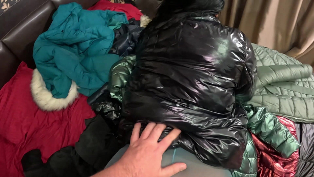 I cleaned out my closet and picked out some of my favorite down jackets. After hearing the sound they make, I felt the need to masturbate and fuck myself while putting them on. My husband's friend wanted to cum on one of the down jackets and I had an intense orgasm while masturbating with the down jackets.