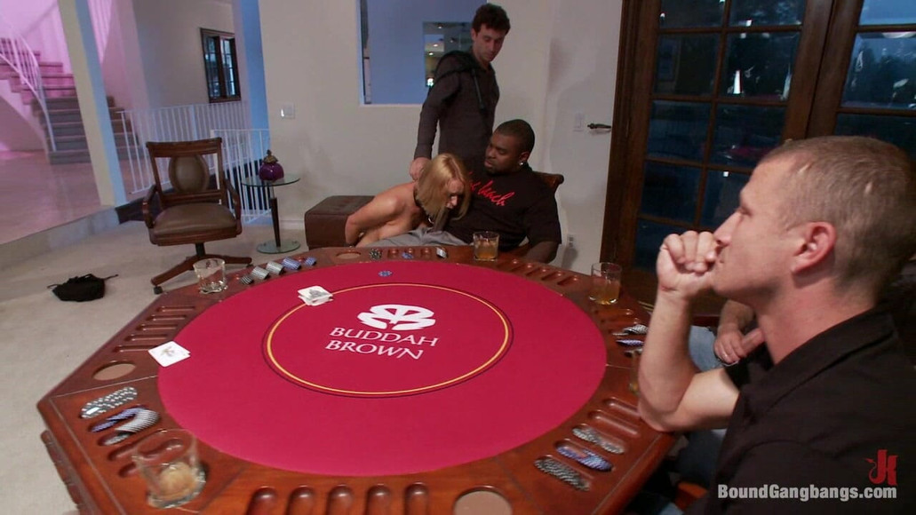 There is a moral to every story, and the moral of this one is simple if you don’t want to get flogged, whipped, and fucked in front of and by all my friends, don’t make a scene in front of my friends! When Krissy Lynn’s playing boyfriend won’t quit playing poker to take her out on a date like he promised she yells at him in front of his friends, somehow thinking it will help her get her way. Instead he sends her upstairs to get “the bag” full of toys and he humiliates her then whores her out to all his buddies. Lots of hardcore double penetration.